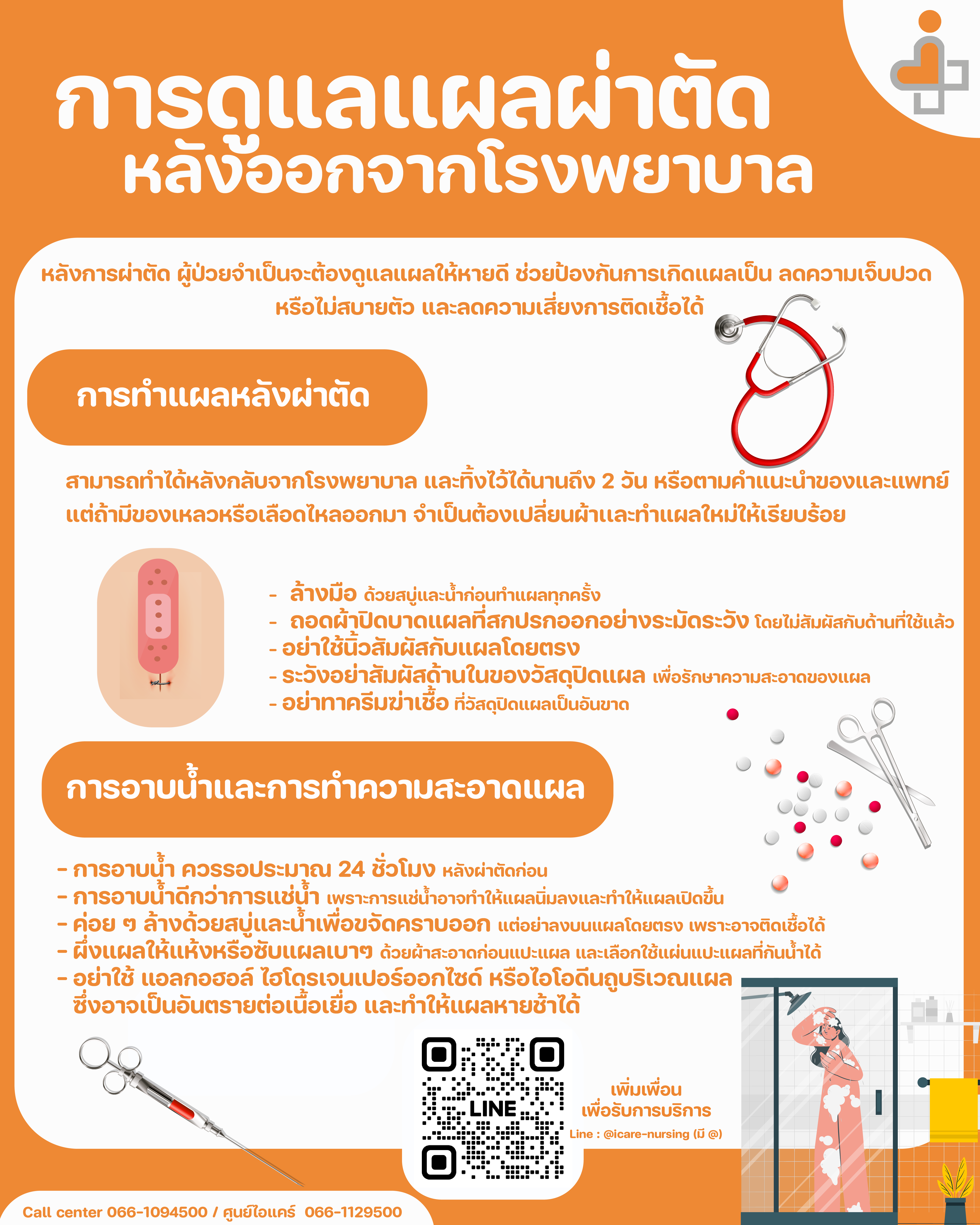 • การดูแลพลาสเตอร์ปิดเปิดแผลตามแพทย์กำหนด พลาสเตอร์เป็นตัวช่วยที่ดีที่แพทย์มักจะใช้ปิดแผลเพื่อการดูแลแผลผ่าตัด เนื่องจากพลาสเตอร์จะช่วยป้องกันไม่ให้แผลติดเชื้อจากสิ่งสกปรก โดยจะพิจารณาจากบริเวณที่มีแผลผ่าตัดหรือความรุนแรงของแผล ดังนั้นจึงไม่ควรเปิดแผลก่อนเวลาที่แพทย์กำหนด และควรสอบถามระยะเวลาในการปิดแผลอย่างชัดเจน เจ้าหน้าที่ของเรานั้นมากประสบการณ์ และจะทำงานภายใต้การควบคุมงานโดยทีมแพทย์และพยาบาลจึงมั่นใจได้ว่าการดูแลรักษาเรื่องนี้นั้นมืออาชีพอย่างแน่นอน