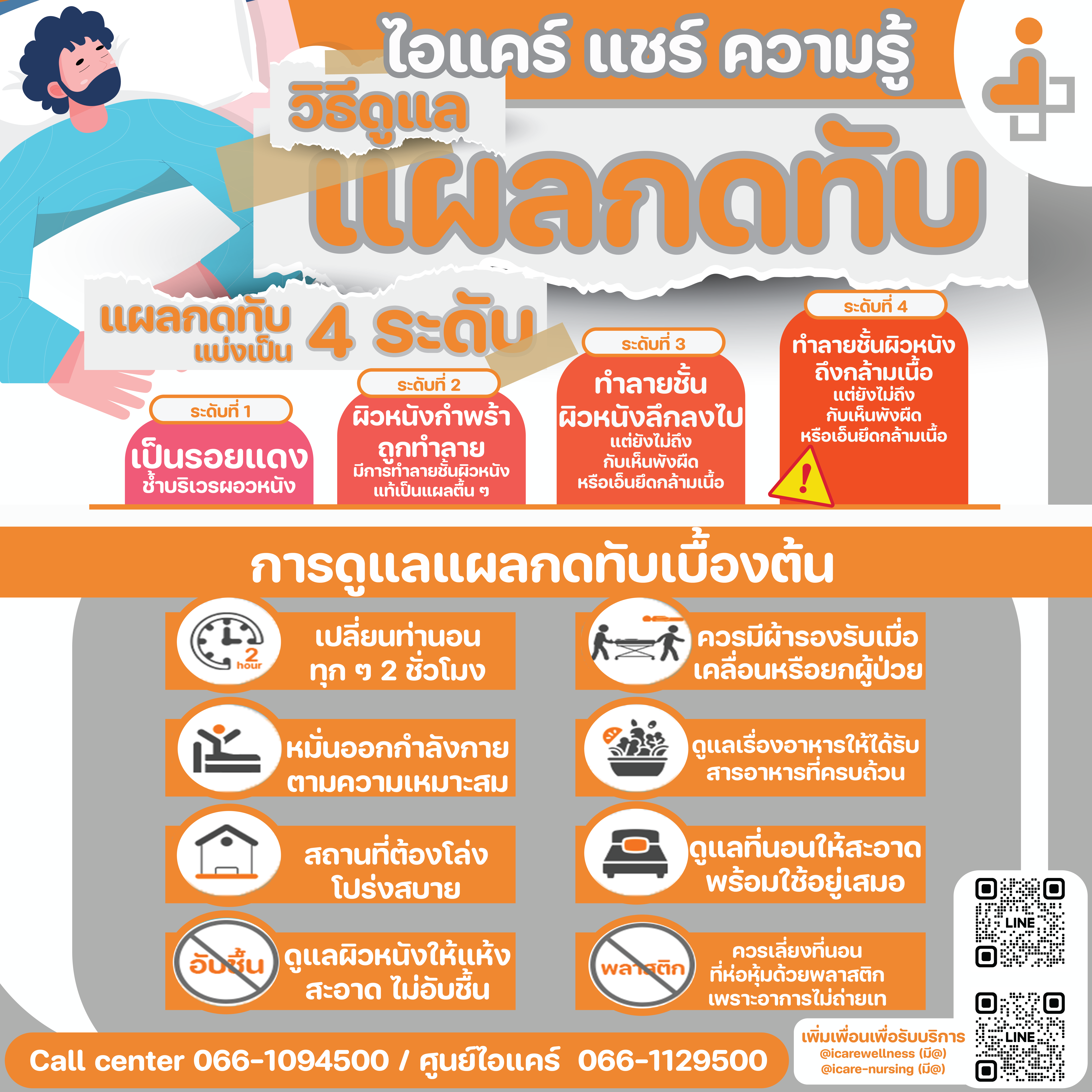 สรุปการดูแลแผลกดทับมีหลักสำคัญคือ ดูแลแผลไม่ให้มีการลุกลามมากขึ้น ร่วมกับการส่งเสริมการหายของแผล ตั้งแต่การทำแผลให้ถูกวิธี การพลิกตะแคงตัวผู้ป่วยเพื่อลดการกดทับและช่วยให้มีการไหลเวียนเลือดได้ดีขึ้น การดูแลเรื่องอาหารเพื่อช่วยส่งเสริมให้แผลหายเร็ว ถ้าพบว่าแผลกดทับลุกลามเพิ่มขึ้นหรือมีการติดเชื้อที่แผล ผู้ป่วยควรได้รับการรักษาในโรงพยาบาลเพื่อการรักษาและให้การดูแลแผลที่เหมาะสมหากท่านกำลังกังวลเรื่องการดูแลผู้ป่วยพักฟื้น ผู้สูงอายุ การกายภาพบำบัด การจัดกิจกรรมบำบัด การชะลอความเสื่อม ให้ ไอแคร์ เวลเนส จำกัด สามารถช่วยท่านดูแล ได้ทั้ง ระยะสั้น และระยะยาวค่ะ (รายวัน รายเดือน รายสัปดาห์) สาขาในเมืองอุบล : 25/1 ถนน บูรพานอก ตำบล ปทุม อำเภอเมืองอุบลราชธานี อุบลราชธานี 34000 MAP : https://maps.app.goo.gl/N1QevUBZrx3Jcsae8 สาขาห้วยวังนอง : 318/118 บ้านค้อเหนือ หมู่12, ตำบล กุดลาด อำเภอเมืองอุบลราชธานี อุบลราชธานี 34000 MAP : https://maps.app.goo.gl/3mfAELzrGKt24G3D9 ********************************* ติดต่อสอบถามเพื่อขอรับบริการ ไอแคร์ เวเนส จำกัด ไอแคร์ เวลเนส เซ็นเตอร์ โทร : 066-112-9500 ไอแคร์ เนอร์สซิ่งโฮมอุบลฯ – i Care โทร : 066-109-4500 Line : @icare-nursing (มี@) อินบล็อกสอบถามได้ตลอด 24 ชั่วโมง ********************************* #ไอแคร์ เวลเนส เซ็นเตอร์ #ไอแคร์ เนอร์สซิ่งโฮมอุบลฯ – i Care  #ศูนย์ดูแลผู้สูงอายุ #อุบลราชธานี #ผู้สูงอายุ #กายภาพ #ดูแลสุขภาพ #ผู้ช่วยพยาบาล #อำนาจเจริญ #ยโสธร #ศรีสะเกษ #ดูแลผู้สูงอายุ #เนอร์สซิ่งโฮม #ประกันสุขภาพ #โรงพยาบาลสรรพสิทธิ์ #อุบลรักษ์ #โรงพยาบาลพริ้นซ์อุบลราชธานี #โรงพยาบาลราชเวช #ไอแคร์ #ศูนย์ฟื้นฟูสุขภาพทุกช่วงวัย #ศูนย์ฟื้นฟูสุขภาพและการดูแลผู้สูงอายุ #ดูแลผู้สูงอายุ #กายภาพ #ดูแลคนชรา #ดูแลคนแก่ #ดูแลผู้ป่วยพักฟื้น #ห้องพักฟื้น #กิจกรรมบำบัด